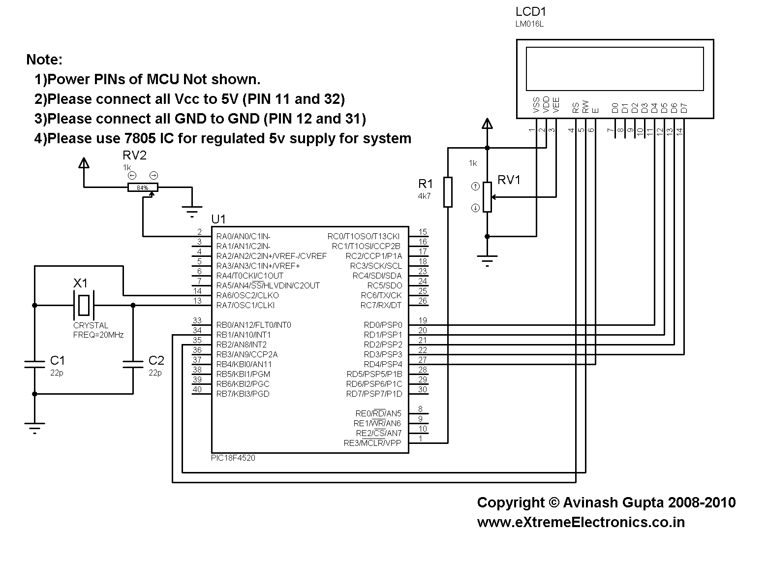 The following image shows the basic hardware required to run the above code. Note that the crystal frequency is 20MHz, so please use this value only, if you want quick and error free operation. Or if you are experienced enough you can sort out errors if any.